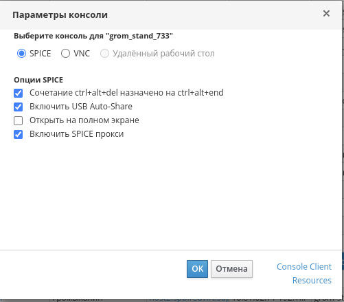 Для подключения к консоли виртуальной машины в веб-интерфейсе выберите нужную виртуальную машину. Перейдите в настройки Параметров консоли (Консоль→Параметры консоли). Включите опцию «Включить SPICE прокси». После чего подключение будет произведено через прокси сервер.